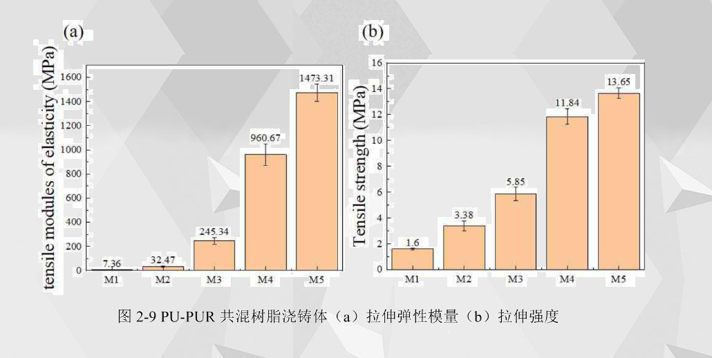 (3)PU-PUR 澆鑄體拉伸彈性模量與拉伸強(qiáng)度分析