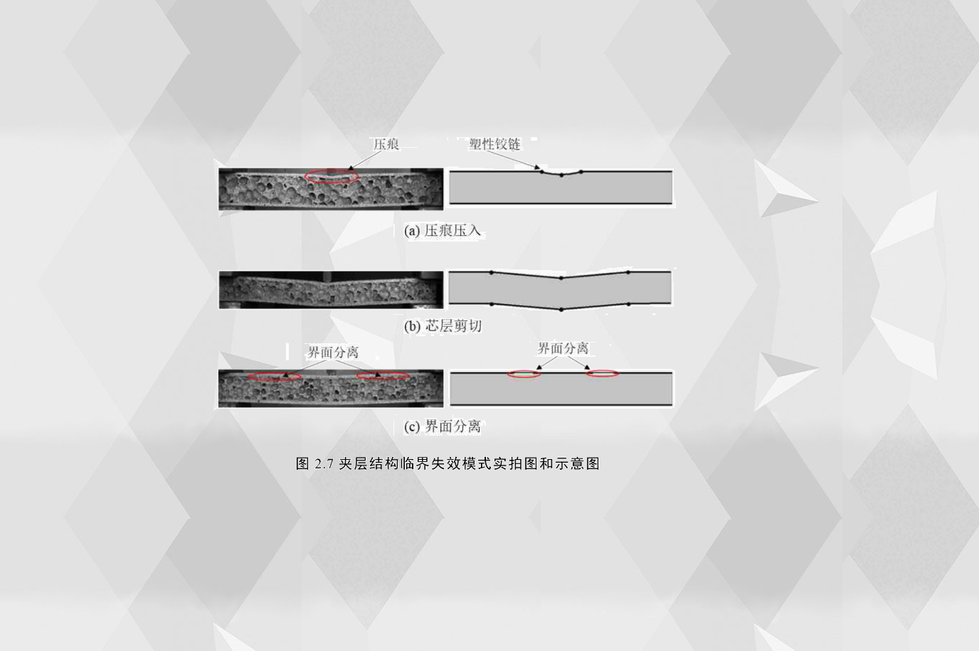 通過實驗觀察分析得出,泡沫夾層結構在彎曲工況下三種主要的臨界失效模式為壓痕壓入、芯層剪切和界面分離,如圖2.7所示。臨界失效模式壓痕壓入(IN)的主要特征是壓頭正下方部分夾層結構的上面板有鉸鏈并且附近的芯層有明顯的局部壓痕;通過圖2.7(a)可以觀測到,壓頭附近的上面板有三個鉸鏈,而在此時刻下面板的位移很小,基本可以忽略其位移量。如圖2.7(b)所示,臨界失效模式芯層剪切(CS) 的主要特征是上下面板位置平行,并且上下面板各有三個鉸鏈,鉸鏈的位置一個位于壓頭正下方,兩外兩個分別位于兩支撐端附近,該失效模式與Ashby等人在參考文獻中提到的ModeB類似。最后一種臨界失效模式為界面分離(DB),夾層結構膠粘劑的完整性確保了載荷在夾層結構各組成部分之間穩定傳遞;根據剪切力互等定理,在臨界失效模式發生之前,泡沫芯層受到的剪切應力等于膠粘劑的剪切應力,但在僅涉及由剪切應力引起的臨界失效模式的情況下,如果夾層結構受到的最大剪切應力超過膠粘劑所能承受的剪切強度,但小于芯層所能承受的剪切強度,則可能會發生界面分離(DB)。