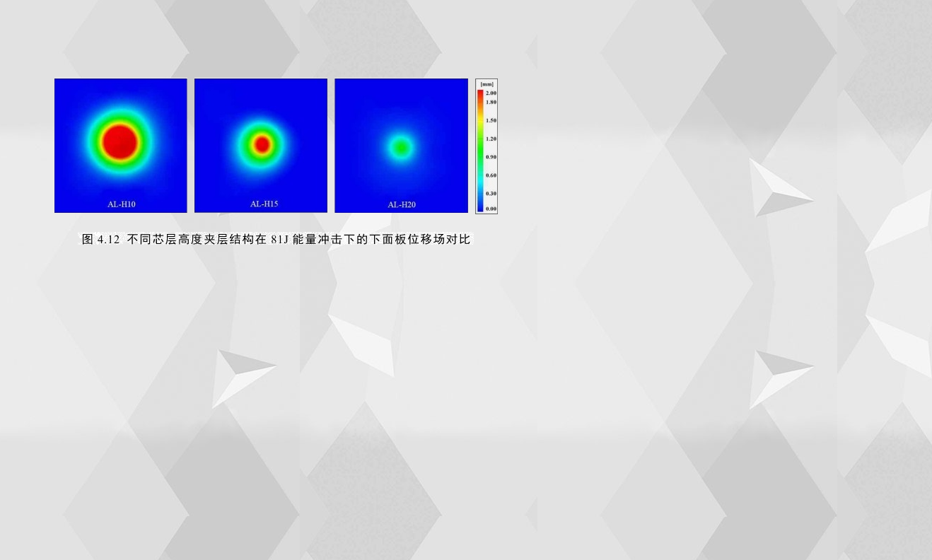 圖4.12比較了三種芯層高度的夾層結(jié)構(gòu)在81J能量沖擊下的下面板位移場,可以發(fā)現(xiàn),位移場以沖擊點(diǎn)為中心呈環(huán)形分布,且隨著芯層厚度的增加,下面板的最大位移量減小,并且變形面積逐漸減少。