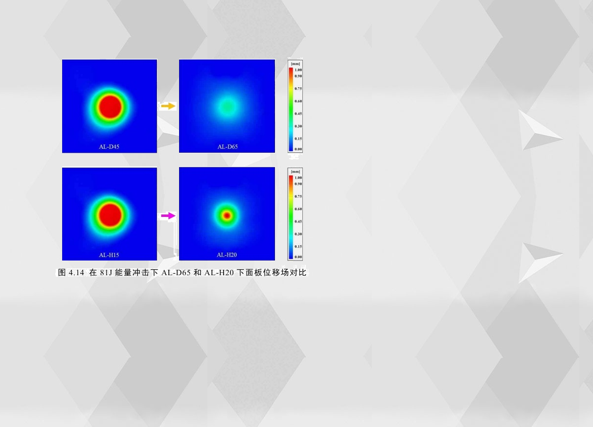 從這些種試件的重量而言,AL-H15到AL-H20增加的質(zhì)量與AL-D45到AL-D65增加的質(zhì)量幾乎相同,而結(jié)合其耐撞性以及比較芯層中密度(AL-D45)到高密度(AL-D65)和芯層中厚度(AL-H15)到芯層高厚度(AL-H20)在相同能量沖擊下的下面板的變形量來說,如圖4.14所示,提高夾層結(jié)構(gòu)泡沫芯層的密度比增加泡沫芯層的高度更能改善其耐沖擊性能。